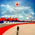 This painting portrays the silhouette of a solitary figure walking along a wide path towards the city. In the background, a vibrant cityscape in bold orange and deep blue tones contrasts with the calm sky. The striking red sun adds a surreal atmosphere, giving the work a unique presence. Blending realistic elements with abstraction, the composition creates a sense of depth and reflection. It is a powerful visual piece that brings both energy and mystery into any interior.