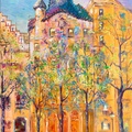 The painting depicts Casa Batlló, Antoni Gaudí’s famous modernist building in Barcelona. Its colourful façade and organic shapes stand behind a row of trees, capturing the unique style that makes this UNESCO World Heritage site one of the city’s most iconic landmarks. Oil, canvas. Signed. Varnished.